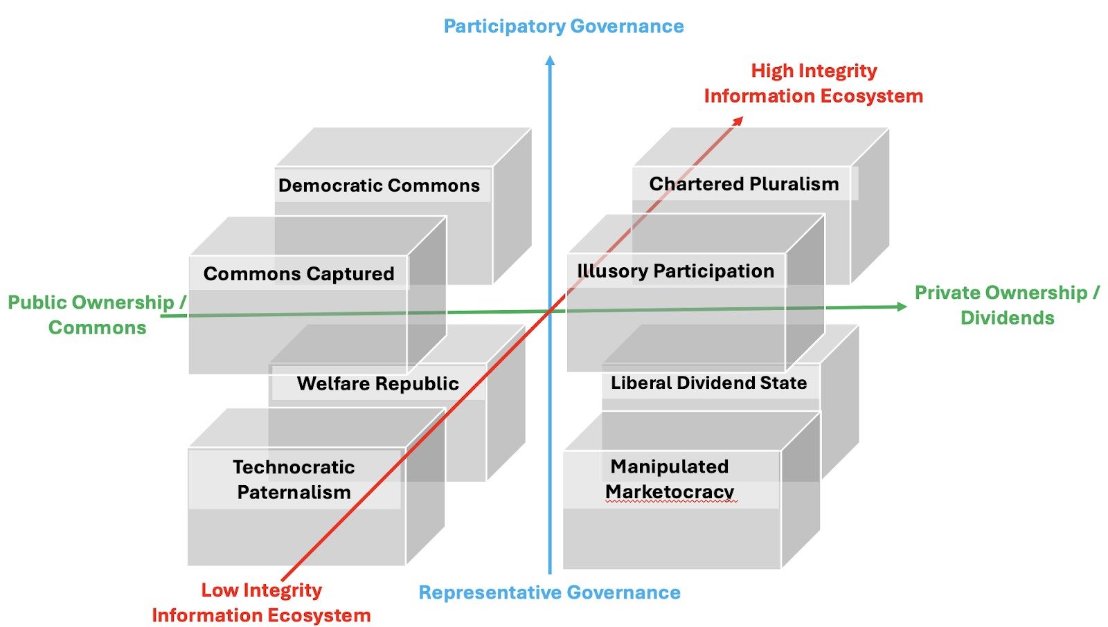 In my previous articles, I highlighted the economic, governance and information integrity challenges emerging in our post-AI era, and some of the possible solutions. To chart a path toward a positive outcome, we need a framework for thinking about how these factors combine into whole systems; to identify system archetypes, which are essentially different combinations of economic model, governance model and information environment that could emerge as AI transforms society.