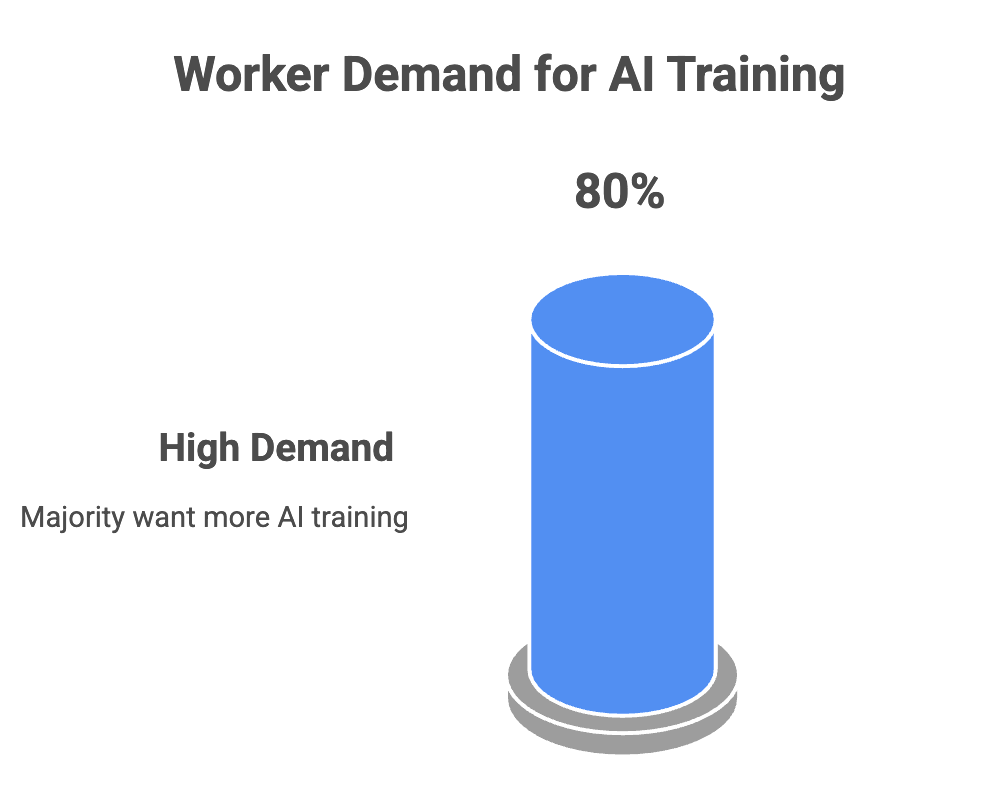Unfortunately, training has not kept pace with deployment. In many companies, AI tools roll quickly in an attempt boost productivity, but structured enablement often lags. Employees are expected to work alongside AI systems without clear guidance, despite 80% of workers saying they want more AI training.