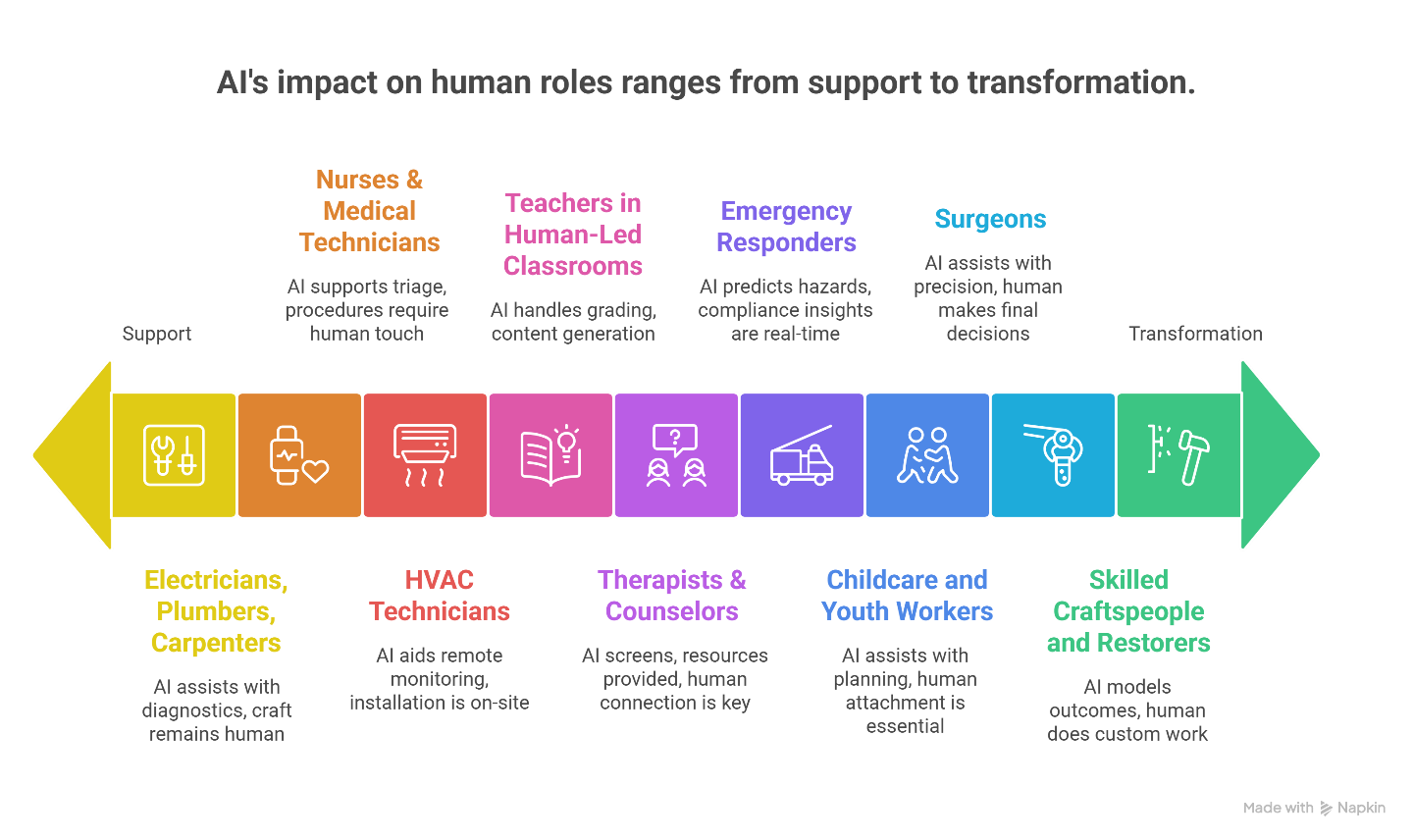 - Skilled trades, caregiving and other hands-on work will remain valuable because AI cannot do them.