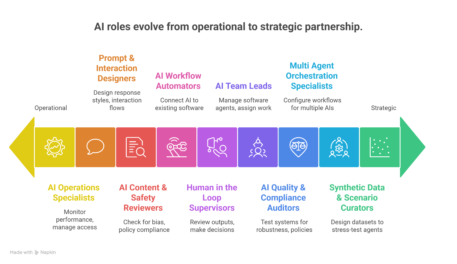 Within two years, as AI becomes more deeply embedded in teams and systems, the roles become more strategic.