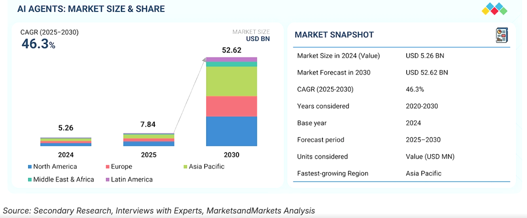 That interest coincides with rapid growth in the underlying market. The AI agent market is projected to grow at a CAGR of 46.3%, expanding from $7.84 billion in 2025 to $52.62 billion by 2030.