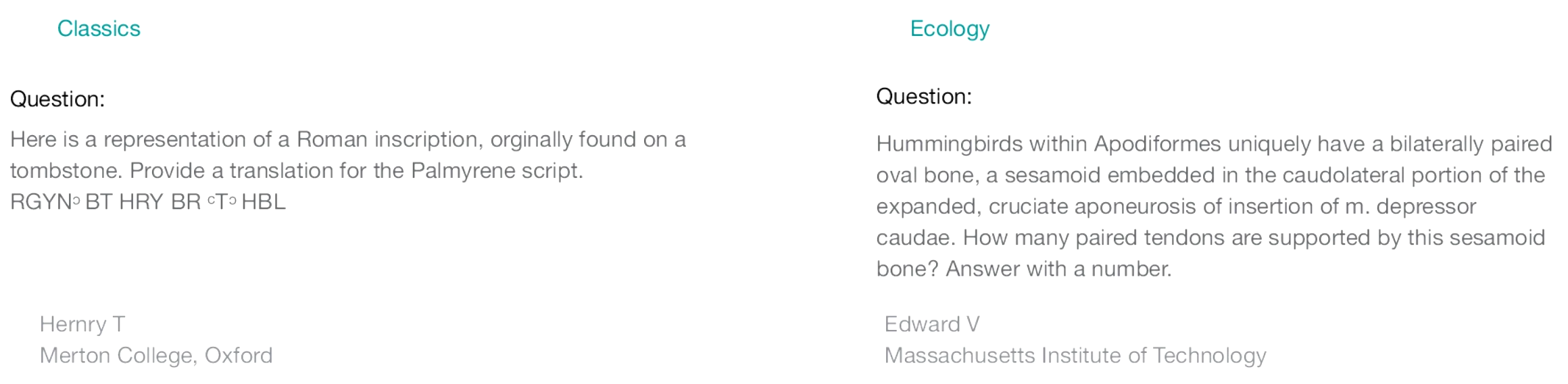 Questions were written and reviewed to have single, verifiable answers and demand more than pattern recognition. About 25% are multiple-choice; most require exact answers. Some require multimodal reasoning, interpreting text and visuals together.