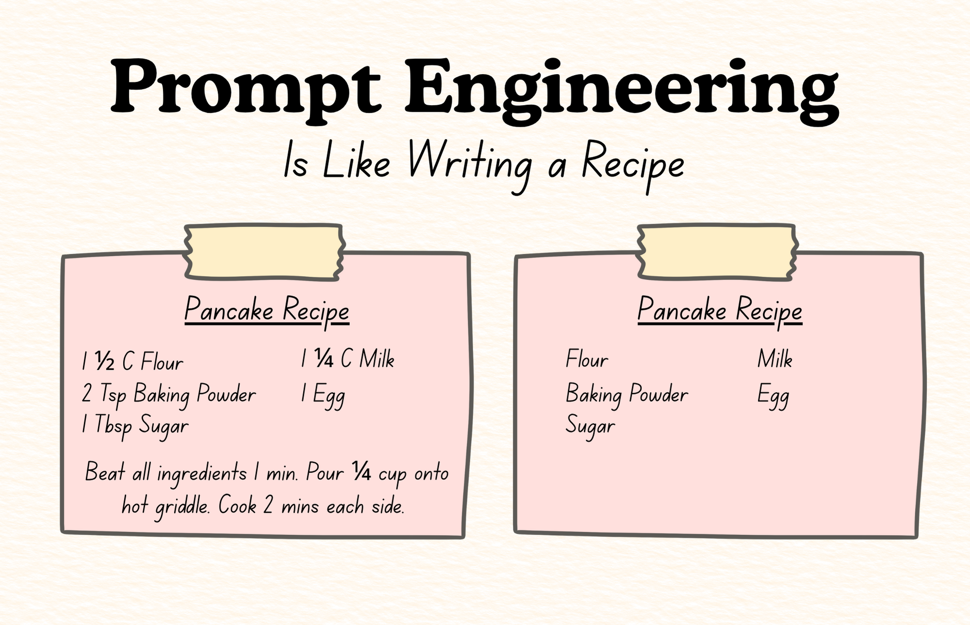 Think of prompt engineering like writing down a sacred family recipe. You wouldn't just write down a list of foods. Instead, you'd include specific amounts for each ingredient and instructions on how to combine them. The more information you include, the better the outcome.