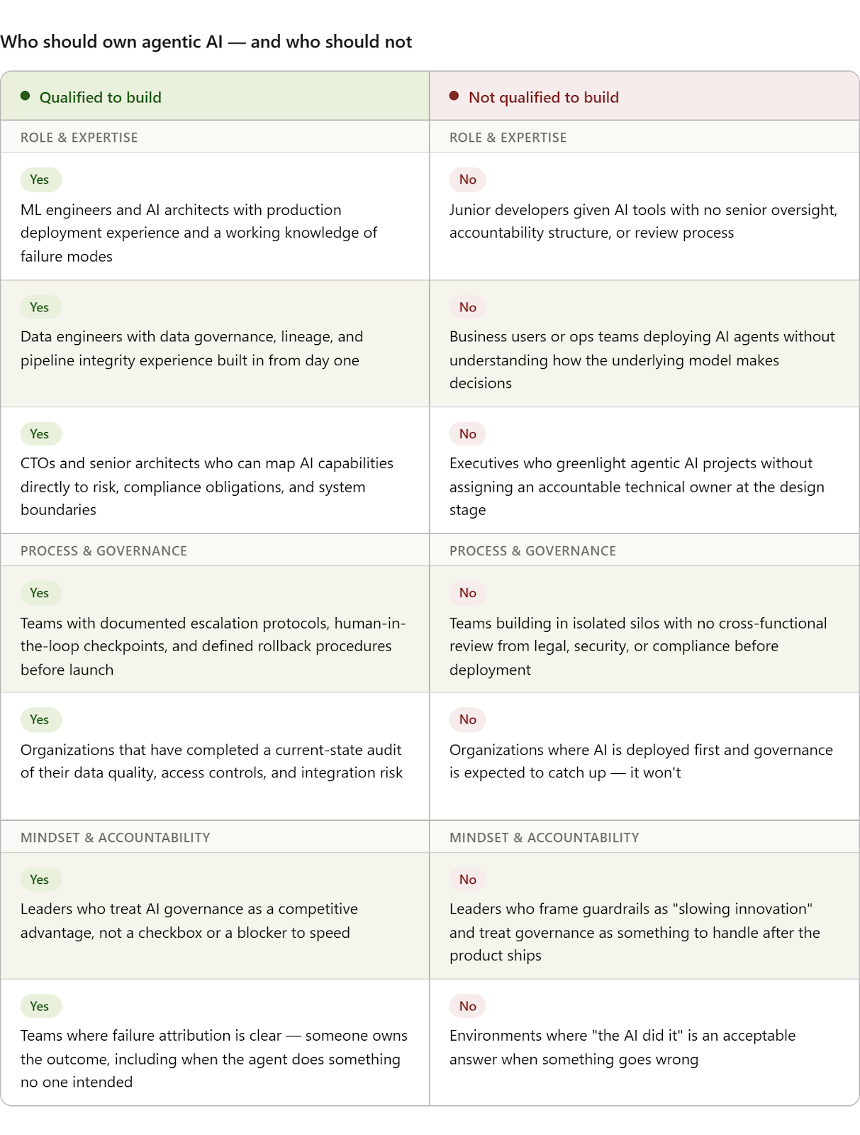 Qualified builders treat guardrails as architecture, not afterthought. They define human-in-the-loop checkpoints before they write the first prompt. They document what the agent should never do as rigorously as what it should do. They have cross-functional sign-off from legal, security and compliance before anything touches production.