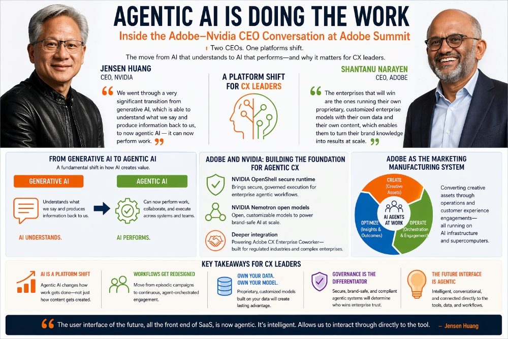 Back to that powerhouse CEO duo on stage here at Adobe Summit. Huang drew a sharp line between generative AI — systems that understand and produce information — and the agentic era now underway, in which AI performs work. For CX leaders who have been watching the AI hype cycle with appropriate skepticism, it was a useful framing.