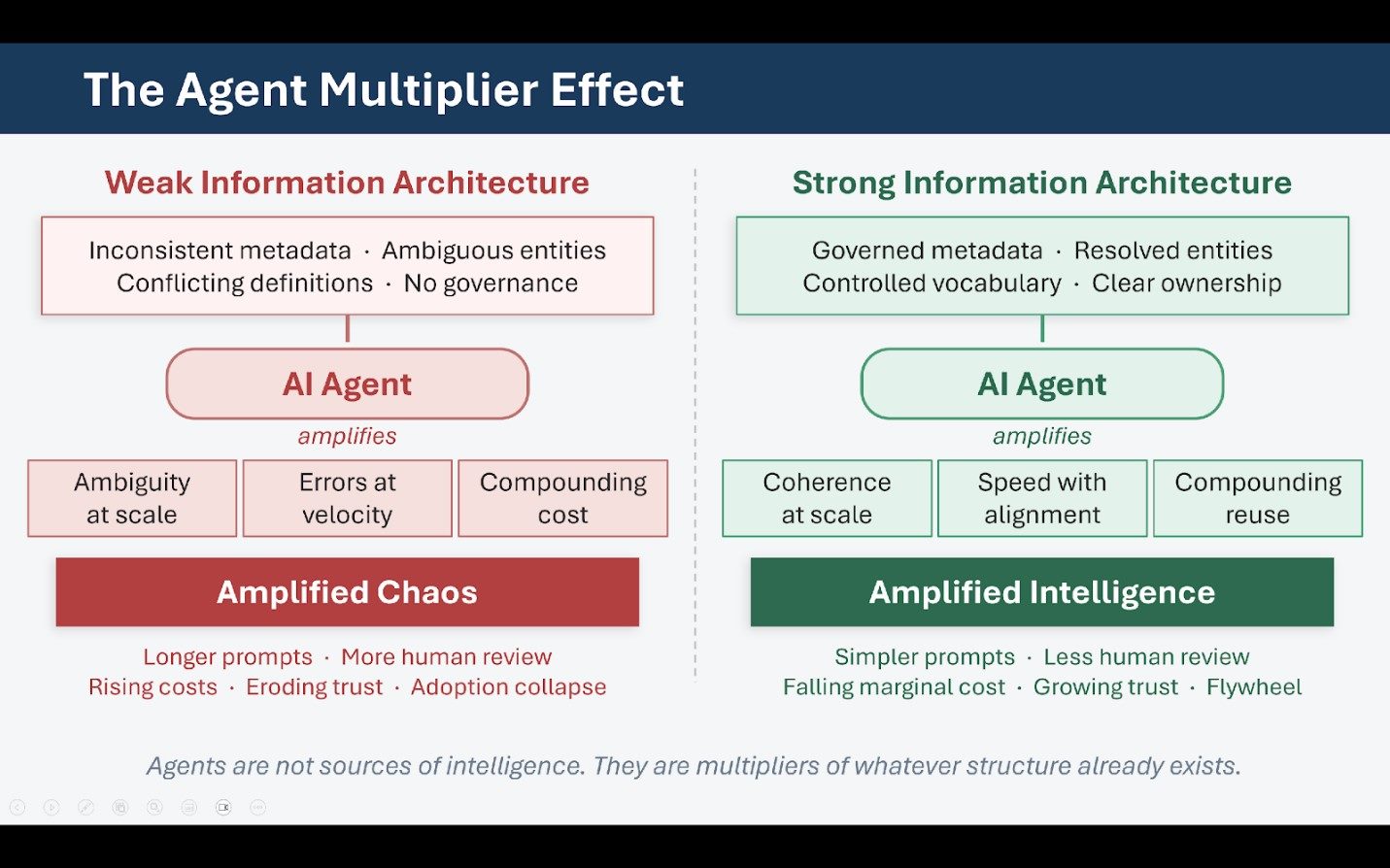 From an economic perspective, this reframes information architecture as capital investment rather than operational expense. Architecture work done once reduces cost and risk across every downstream AI use case. Architecture work deferred becomes a tax that compounds as automation increases. Another implication of the multiplier effect is that agents magnify not only efficiency, but also error velocity. A human making a mistake affects a small number of cases. An agent making the same mistake can affect thousands in minutes.