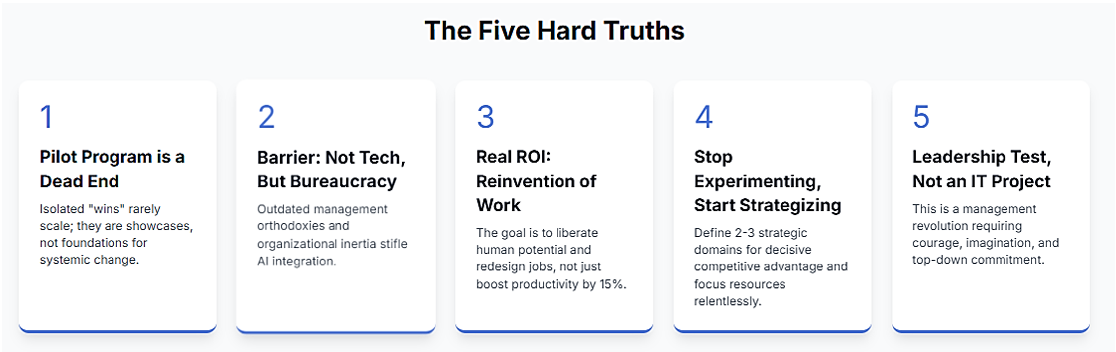 - A Clear, Bold Strategy: Stop the "let a thousand flowers bloom" approach. You must define the 2-3 strategic domains where AI will give you a decisive, undeniable competitive advantage and focus your resources there with relentless intensity.