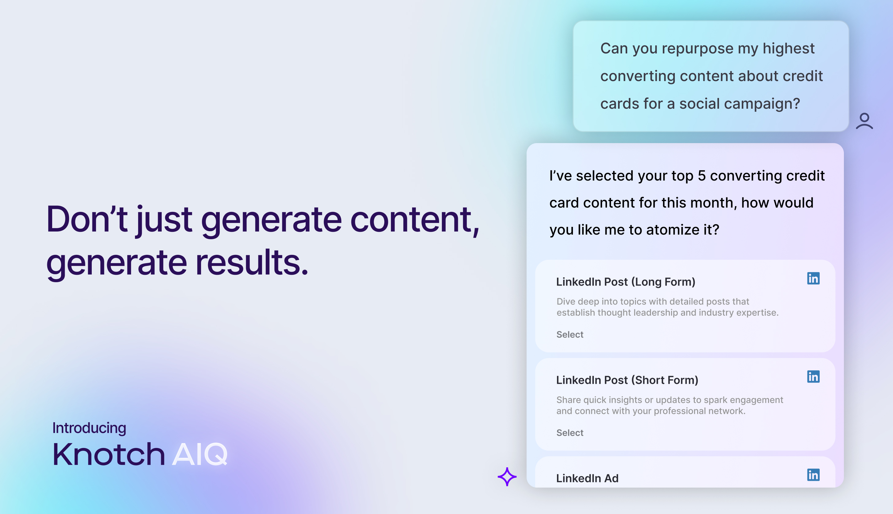 NEW YORK, Feb. 28, 2024 (GLOBE NEWSWIRE) -- Knotch today announced the launch of Knotch AIQ, a new generative-AI product within its digital intelligence platform designed for content-driven brands. AIQ makes it easy for marketers to generate high-performing new content, optimize existing content and perfect web experiences by tapping into brand-specific performance data. Marketers can track digital content performance across the entire customer journey, uncover powerful insights and take action with the click of a button to drive increased business results.